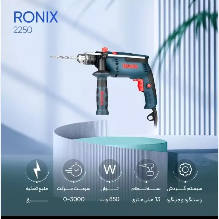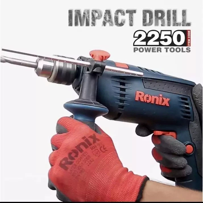دریل چکشی رونیکس مدل 2250 - مجهز به موتور پر قدرت صنعتی متشکل از آرمیچر و بالشتک تولید شده توسط دستگاههای تمام اتوماتیک - دارای کلید الکترونیک دیمردار ضد غبار - دارای دکمه قفل کن در وضعیت روشن - دارای سه نظام 13 میلیمتری آچاری با کیفیت جهت دستیابی به حداکثر گیرایی ابزار - طراحی بدنه ارگونومیک با بالاترین کیفیت - مجهز به دسته جانبی گردان ارگونومیک 360 درجه -دارای مکانیزم ضربه ای (چکشی) - 850 وات